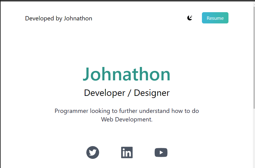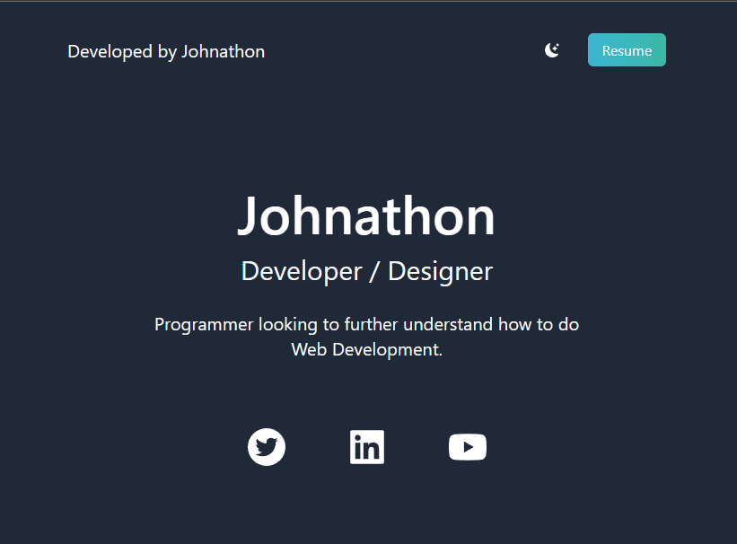 The website was also optimized to include Dark Mode. The user could click the crescent by the Resume button and it would change all of the text to white and the background to a dark gray color.