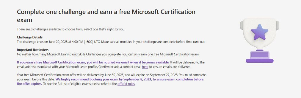The Microsoft website that is being used has provided us the opportunity to learn and get certified with Microsoft for free. After completing one of the challenges by going through the learn portal, we will get one test voucher that can be used on the tests that were listed.