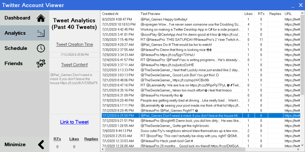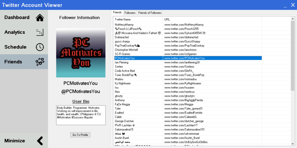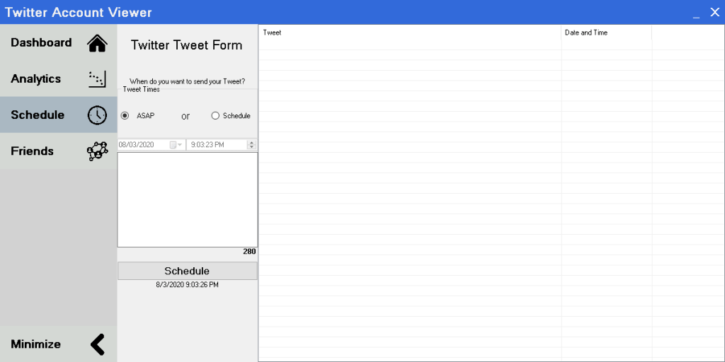 This is a program designed to display a users Twitter Account and allow them the ability to check profile analytics, post scheduled tweets, and see those who are Following/Followers.