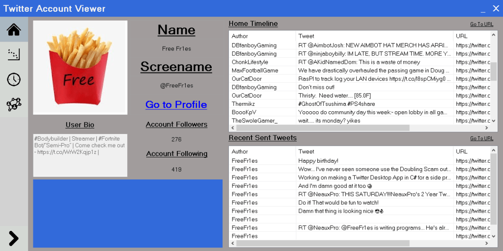 | Technologies Used | C#. Net (Winform), Visual Studio, JSON, Tweetinvi API |